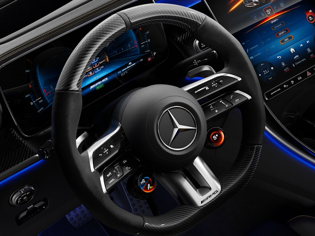 AMG Performance steering wheel in carbon design with MICROCUT microfibre delivers grip, sportiness, and intuitive control.