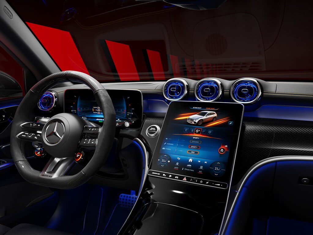 The optimised MBUX multimedia system in the AMG GLC offers numerous AMG‑specific displays and functions. Whether in the instrument cluster, central multimedia display, or head‑up display, it ensures all key information is always in view for a focused, dynamic driving experience.