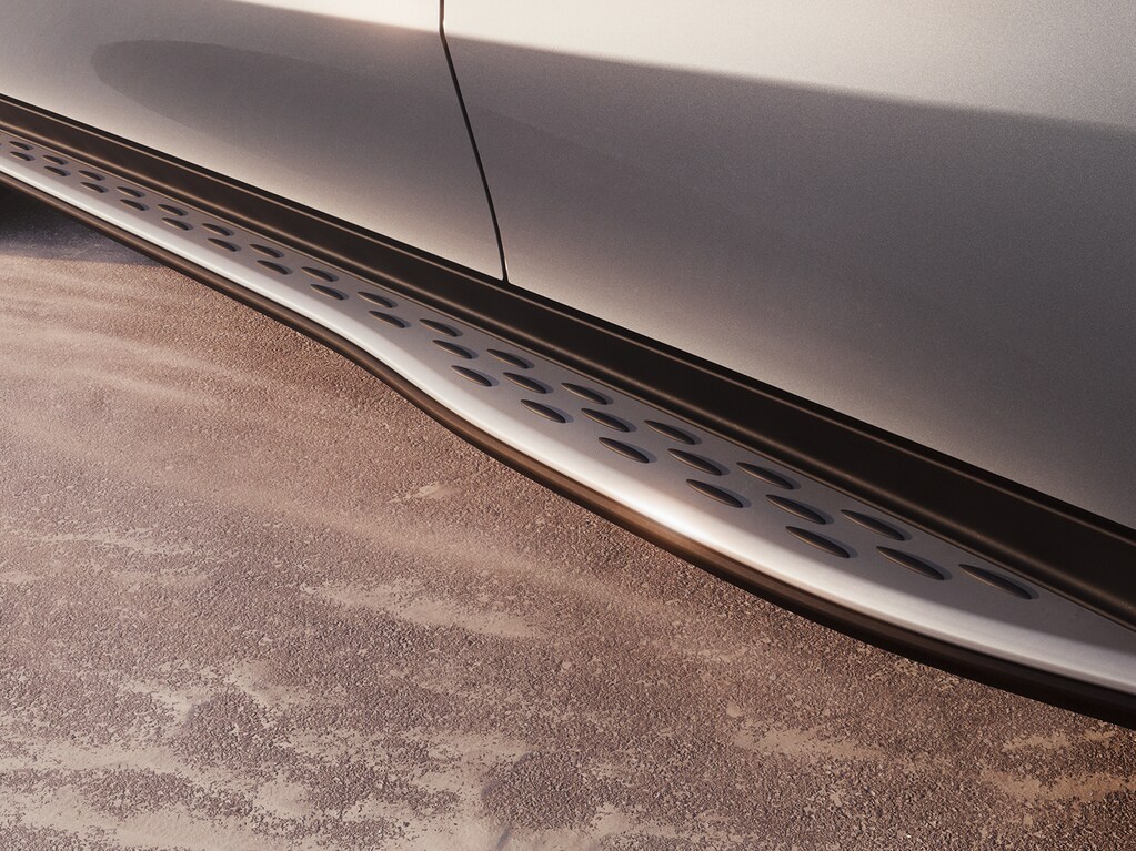The optional aluminium‑look running boards emphasise the SUV character of the GLC while making entry easier. Their sporty shaped design tapers at the front doors and widens toward the rear, adding both function and style.