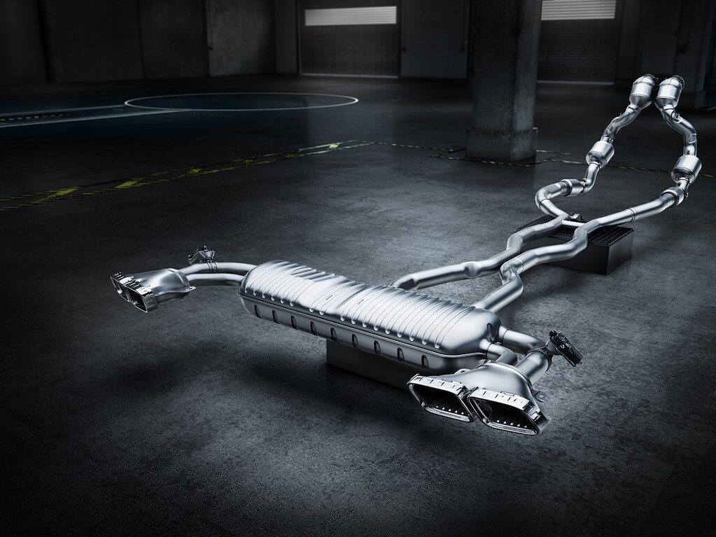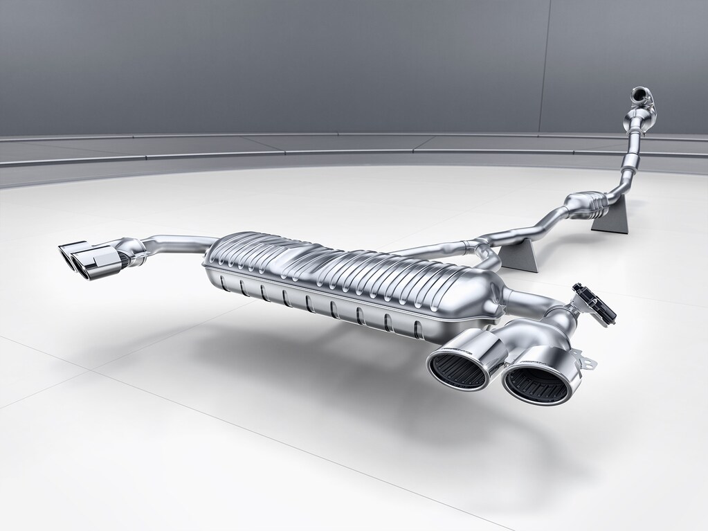 The AMG performance exhaust system, fitted as standard, delivers a distinctive acoustic experience. With variably adjustable exhaust flaps, the sound can be changed at the touch of a button. Depending on the selected drive mode, the tone ranges from discreet comfort to an expressive, performance‑driven roar.